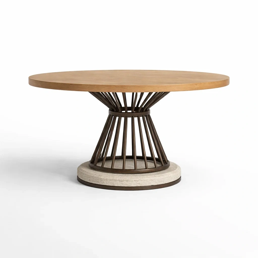 Il tavolo da pranzo presenta una superficie in legno massello e una base in metallo verniciato nero.